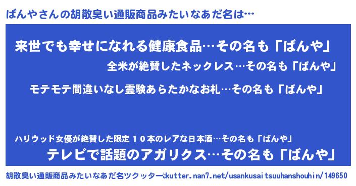 | 男性向けラノベタイトル風あだ名 | 『転生したらばんやだった件』 |