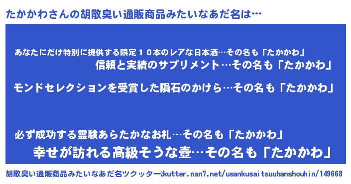 | 男性向けラノベタイトル風あだ名 | 『たかかわに滅ぼされるだけの簡単なお仕事です』 |