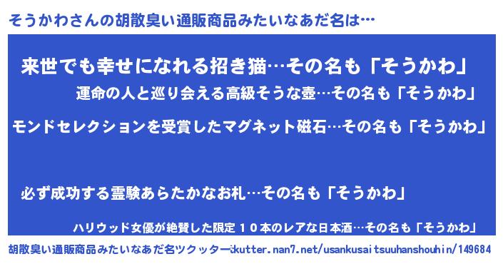 | ヒーロー風カッコイイあだ名 | 『慈愛の使者そうかわ』『ネオソウカワ』 |