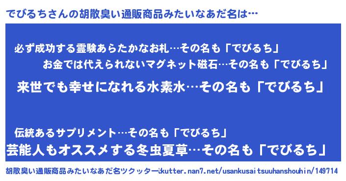 | 男性向けラノベタイトル風あだ名 | 『でびるちという概念が存在しない退屈な世界 』 |