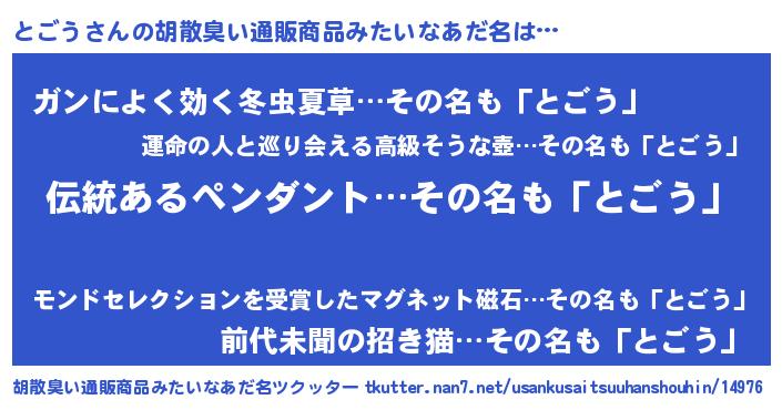 | 恥ずかしいあだ名 | 『トゴリンリン』『トゴウデラックス』 |