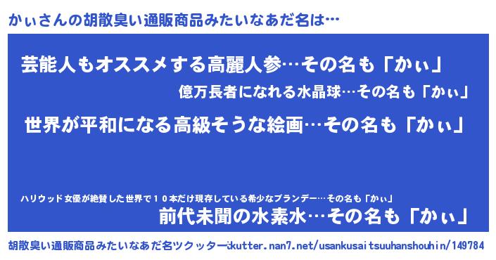 | ヘコむあだ名 | 『なまこ酢』『かぃ(爆)』『かぃにー』 |