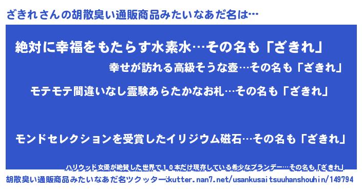 | 意味不明あだ名 | 『ペロリンざきれ』『永久保存ざきれ』 |