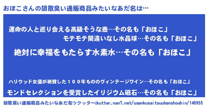 | 男性向けラノベタイトル風あだ名 | 『おほこという概念が存在しない退屈な世界 』 |