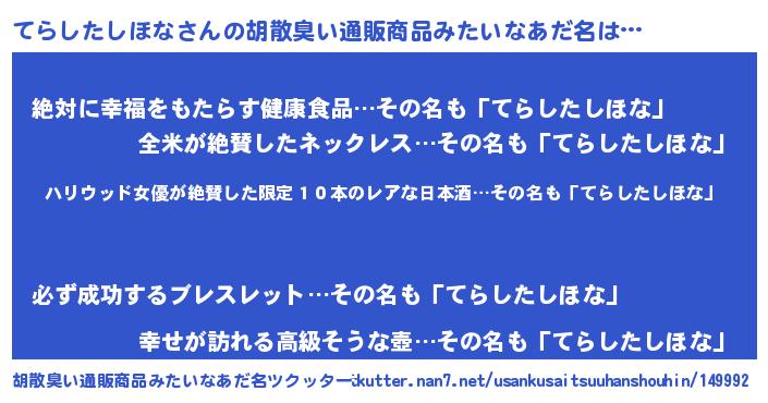 | ヘコむあだ名 | 『てらしたしほな(爆)』『牛乳』 |