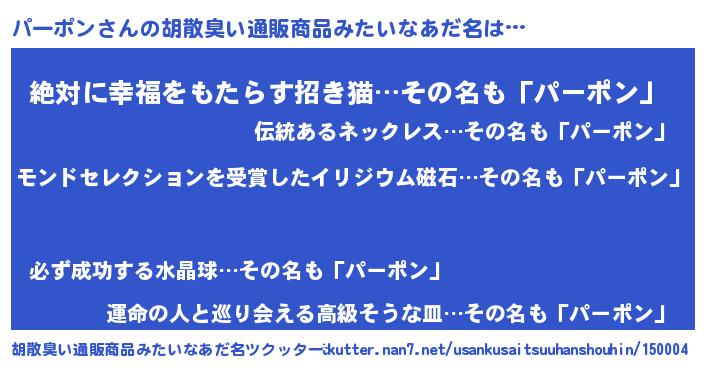 | 男性向けラノベタイトル風あだ名 | 『パーポンに滅ぼされるだけの簡単なお仕事です』 |