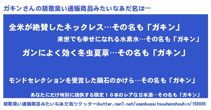 | 意味不明あだ名 | 『自称ガキン』『とにかく怪しいガキン』 |