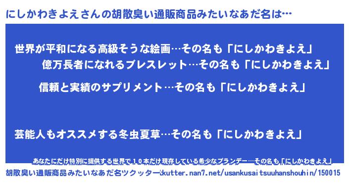 | 欧米人風あだ名 | 『ウサインにしかわきよえ』 |