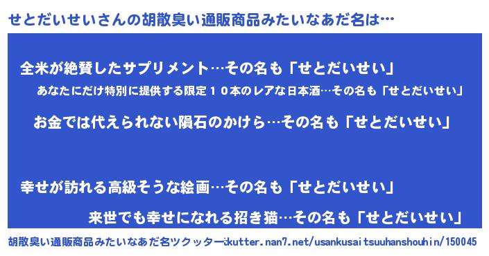 | ヘコむあだ名 | 『せとぷりん』『せとだいせい(遠い目)』 |