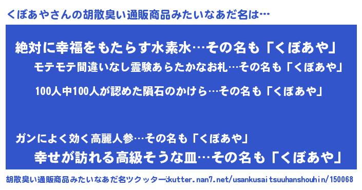 | 男性向けラノベタイトル風あだ名 | 『おまえをオタクにしてやるから、俺をくぼあやにしてくれ! 』 |