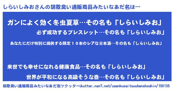 | 意味不明あだ名 | 『住所不定無職しらいしみお(62歳)』 |