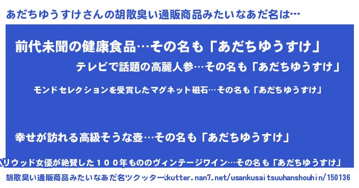 | ヘコむあだ名 | 『あだちゆうすけ(小並感)』『酢こんぶ』 |
