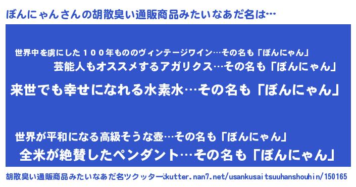| ヘコむあだ名 | 『ぼんにゃん(遠い目)』『ぼんお』 |