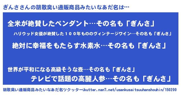 | 男性向けラノベタイトル風あだ名 | 『緋弾のギンサ』『魔弾の王とぎんさ』 |