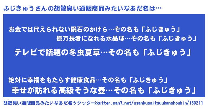 | 男性向けラノベタイトル風あだ名 | 『Re:ふじきゅうから始める異世界生活』 |