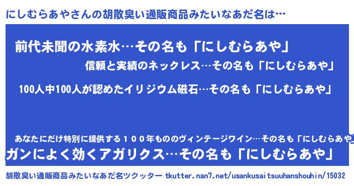 | 男性向けラノベタイトル風あだ名 | 『おまえをオタクにしてやるから、俺をにしむらあやにしてくれ! 』 |