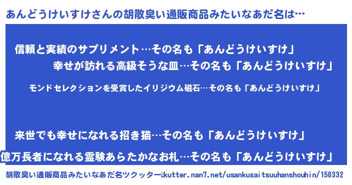 | 女子向けラノベタイトル風あだ名 | 『あんどうけいすけの玉の輿計画!』 |