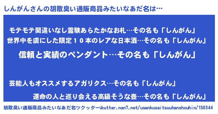 | 男性向けラノベタイトル風あだ名 | 『シンガンスレイヤー』『しんがんの憂鬱』 |
