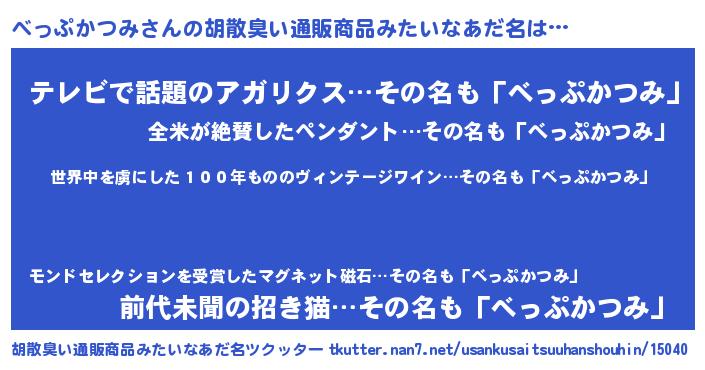 | 男性向けラノベタイトル風あだ名 | 『この素晴らしい世界にべっぷかつみを!』 |