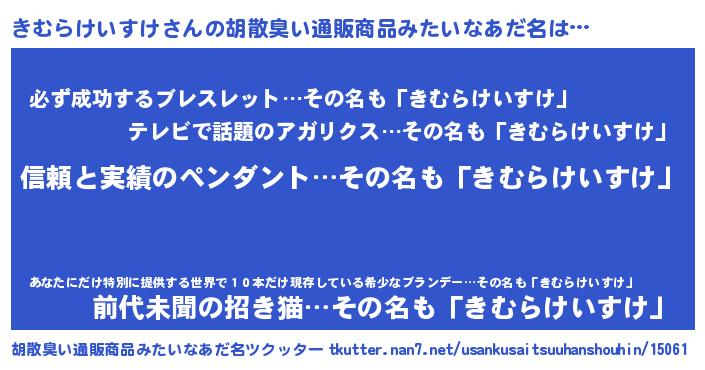 | 男性向けラノベタイトル風あだ名 | 『キムラケイスケスレイヤー』 |