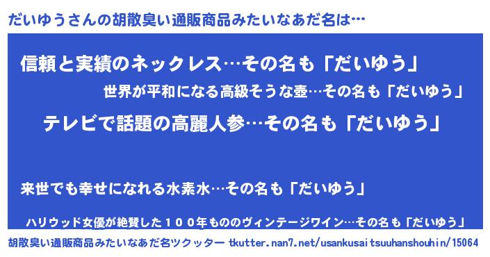 | 意味不明あだ名 | 『自称だいゆう』『もやし科だいゆう属』 |