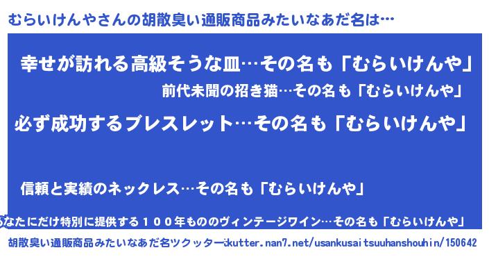 | 男性向けラノベタイトル風あだ名 | 『むらいけんやの憂鬱』 |