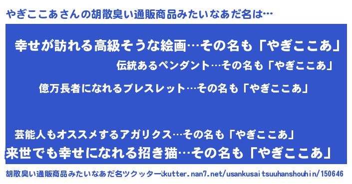 | ヘコむあだ名 | 『やぎにー』『酢こんぶ』『やぎお』 |