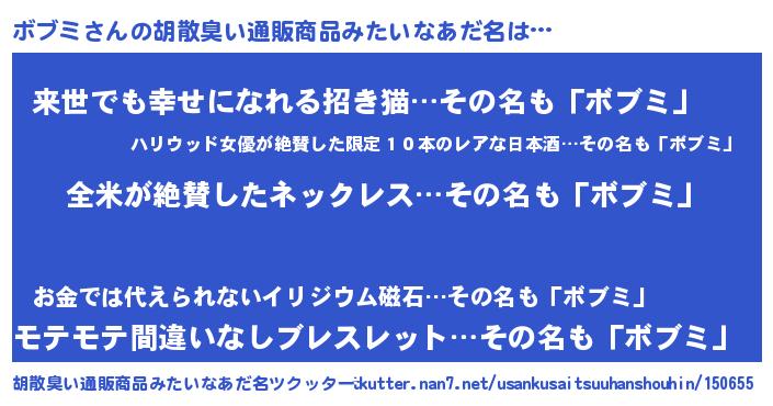 | 男性向けラノベタイトル風あだ名 | 『ボブミの嫁は女の子じゃないと思った?』 |