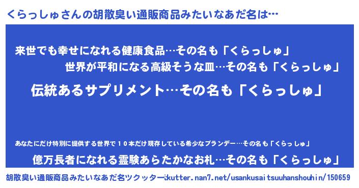 | 男性向けラノベタイトル風あだ名 | 『くらっしゅの嫁は女の子じゃないと思った?』 |
