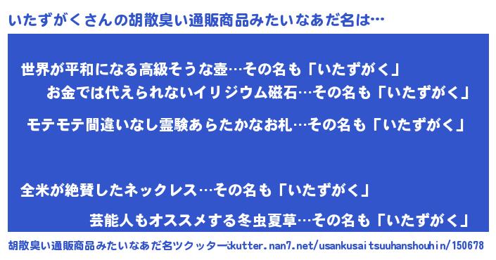 | 男性向けラノベタイトル風あだ名 | 『転生したらいたずがくだった件』 |