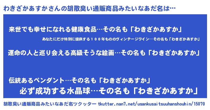 | ヘコむあだ名 | 『酢こんぶ』『わきざかあすか(笑)』 |