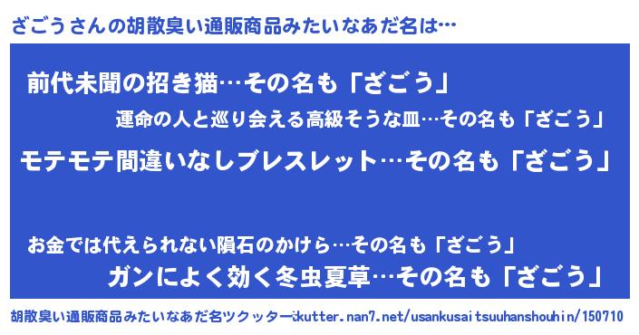 | ヘコむあだ名 | 『ざごにー』『ざごう(笑)』『つくし』 |