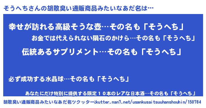 | ヒーロー風カッコイイあだ名 | 『魔戒騎士ソウ』『ウルトラそうへちマン』 |