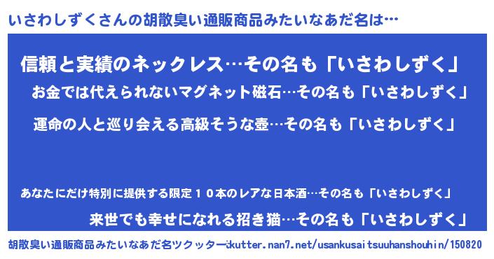 | 男性向けラノベタイトル風あだ名 | 『いさわしずく~年齢イコール彼女いない歴の魔法使い~』 |