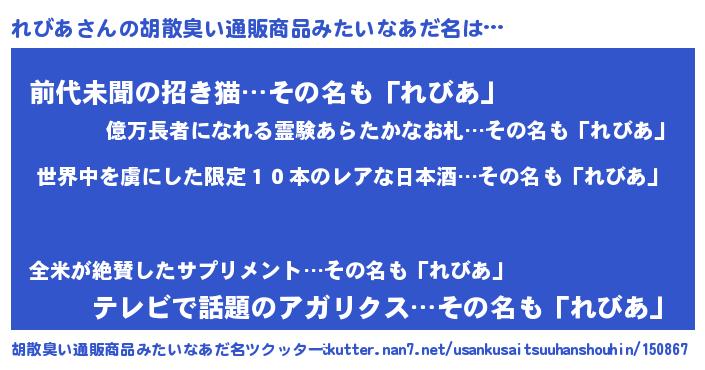 | ヘコむあだ名 | 『れびあ(笑)』『れびもー』『れびを』 |