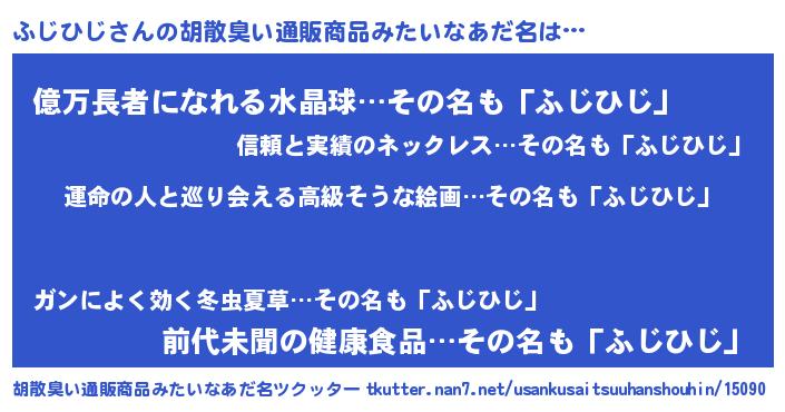 | 男性向けラノベタイトル風あだ名 | 『ふじひじ~年齢イコール彼女いない歴の魔法使い~』 |