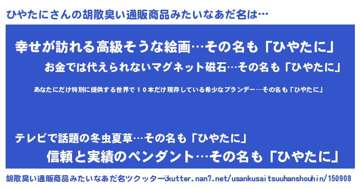 | 男性向けラノベタイトル風あだ名 | 『ひやたに~年齢イコール彼女いない歴の魔法使い~』 |