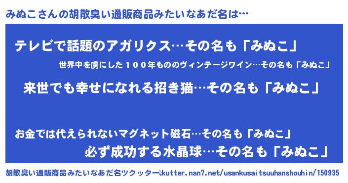 | ヒーロー風カッコイイあだ名 | 『ネオミヌコ』『超時空戦士ミヌコ』 |