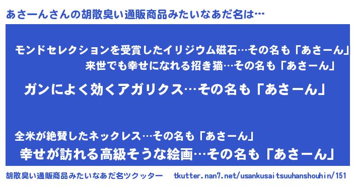 あさーんさんの胡散臭い通販商品みたいなあだ名をツクッター!
