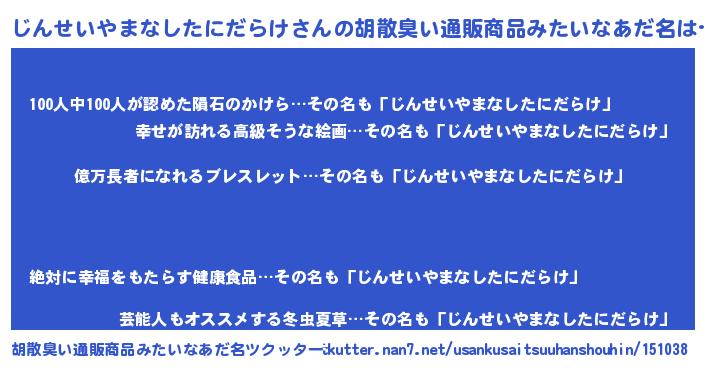 | 男性向けラノベタイトル風あだ名 | 『じんせいやまなしたにだらけに滅ぼされるだけの簡単なお仕事です』 |