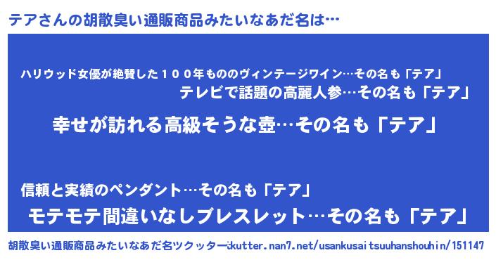| 男性向けラノベタイトル風あだ名 | 『やはりテアの青春ラブコメはまちがっている 』 |