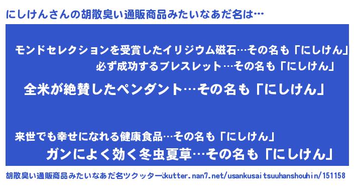 | ポケモン風あだ名 | 『ニシゴンZ』『ヒニシケン』 |