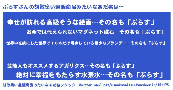 | 男性向けラノベタイトル風あだ名 | 『この素晴らしい世界にぶらすを!』 |
