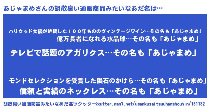 | 意味不明あだ名 | 『自称あじゃまめ』『ペロリンあじゃまめ』 |