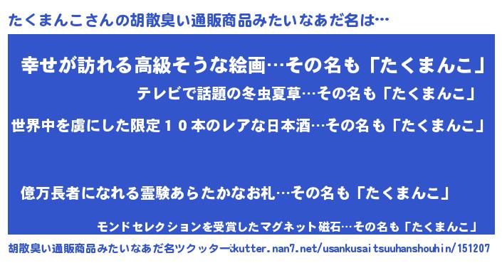 | ヒーロー風カッコイイあだ名 | 『仮面タクダー』『正義の使者たくまんこ』 |