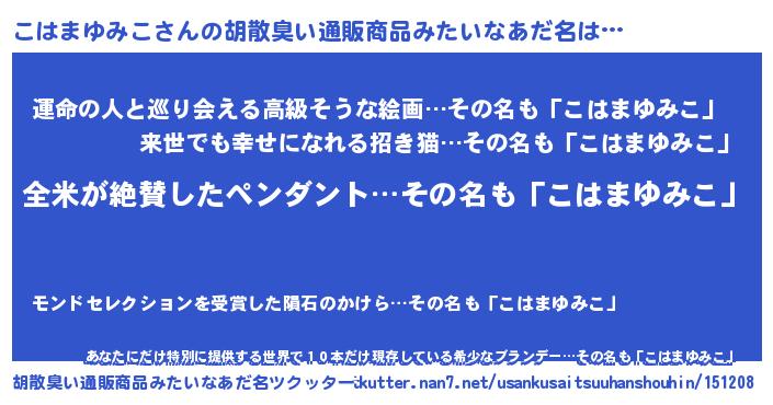 | 男性向けラノベタイトル風あだ名 | 『こはまゆみこ~年齢イコール彼女いない歴の魔法使い~』 |