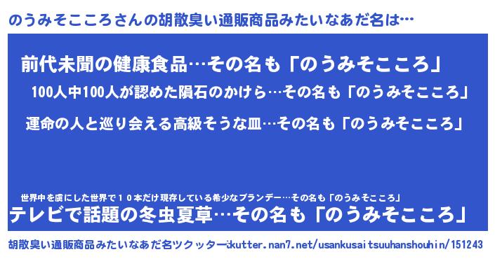 | 男性向けラノベタイトル風あだ名 | 『のうみそこころ~年齢イコール彼女いない歴の魔法使い~』 |