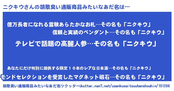 | 男性向けラノベタイトル風あだ名 | 『Re:ニクキウから始める異世界生活』 |
