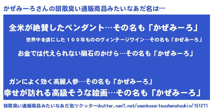 | 男性向けラノベタイトル風あだ名 | 『おまえをオタクにしてやるから、俺をかぜみーろにしてくれ! 』 |