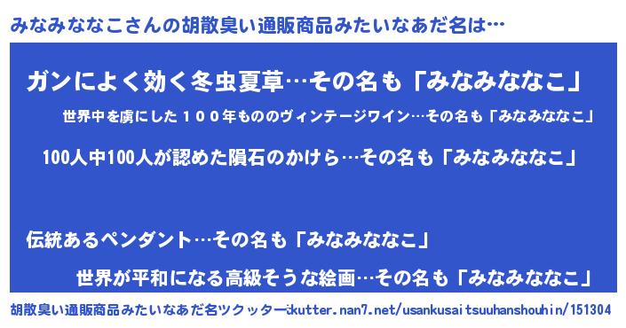 | 男性向けラノベタイトル風あだ名 | 『おまえをオタクにしてやるから、俺をみなみななこにしてくれ! 』 |